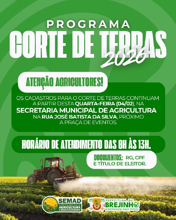 A Prefeitura de Brejinho, por meio da Secretaria Municipal de Agricultura e Desenvolvimento (SEMAD), informa à população rural o lançamento do Programa Corte de Terras 2026, uma importante iniciativa de apoio ao agricultor, que fortalece a produção agrícola e impulsiona o desenvolvimento do campo.