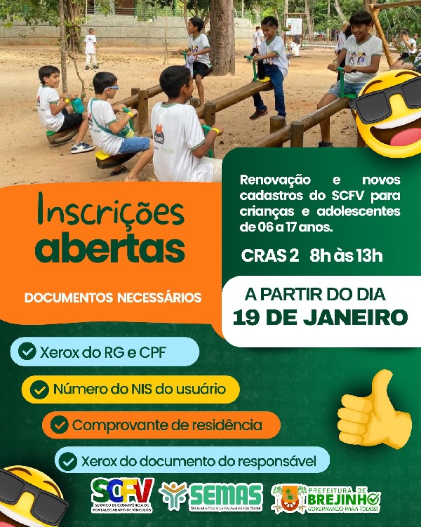 Renovação e novos cadastros Para crianças e adolescentes de 06 a 17 anos.