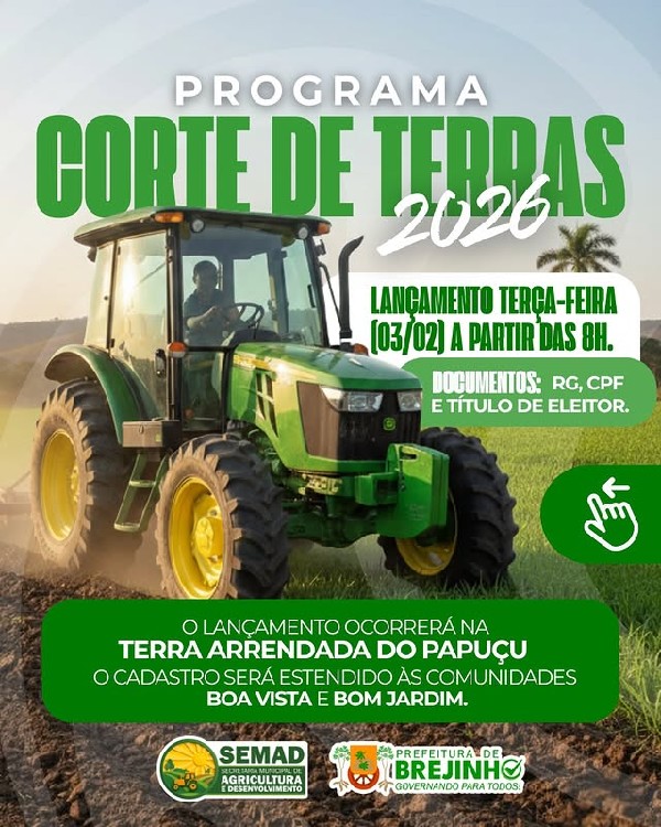 A Prefeitura de Brejinho, por meio da Secretaria Municipal de Agricultura e Desenvolvimento (SEMAD), informa à população rural o lançamento do Programa Corte de Terras 2026, uma importante iniciativa de apoio ao agricultor, que fortalece a produção agrícola e impulsiona o desenvolvimento do campo.